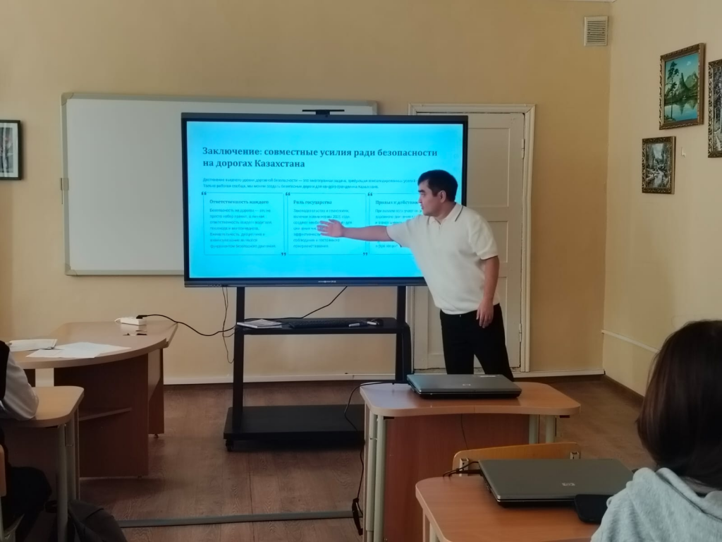 "Жол қозғалысы қауіпсіздігі апталығы" республикалық акциясы аясында 8-9 сыныптарда "Қазақстандағы ЖКО және қауіпсіздік шаралары: сын-тегеуріндер мен шешімдер" тақырыбында сынып сағаты өтті Жетекшісі Сапарбеков А. Е.