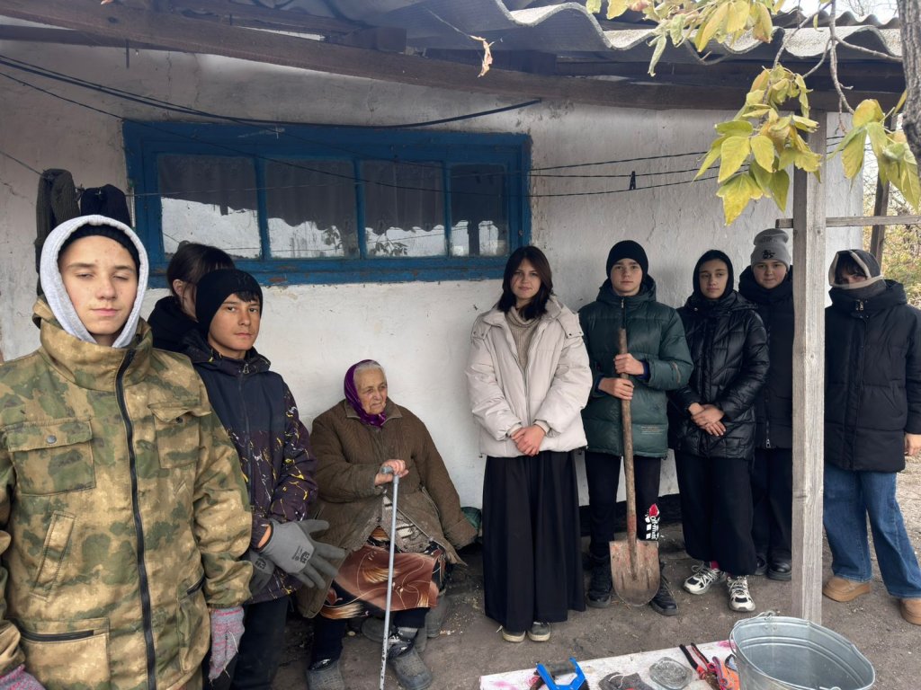 Қарттарды әлеуметтік қолдау айлығын өткізу жоспары бойынша біздің мектептің жоғары сынып оқушылары "Қамқорлық" акциясына қатысады. Бүгін олар біздің ауылдың еңбек ардагеріне барып, көмек көрсетті.