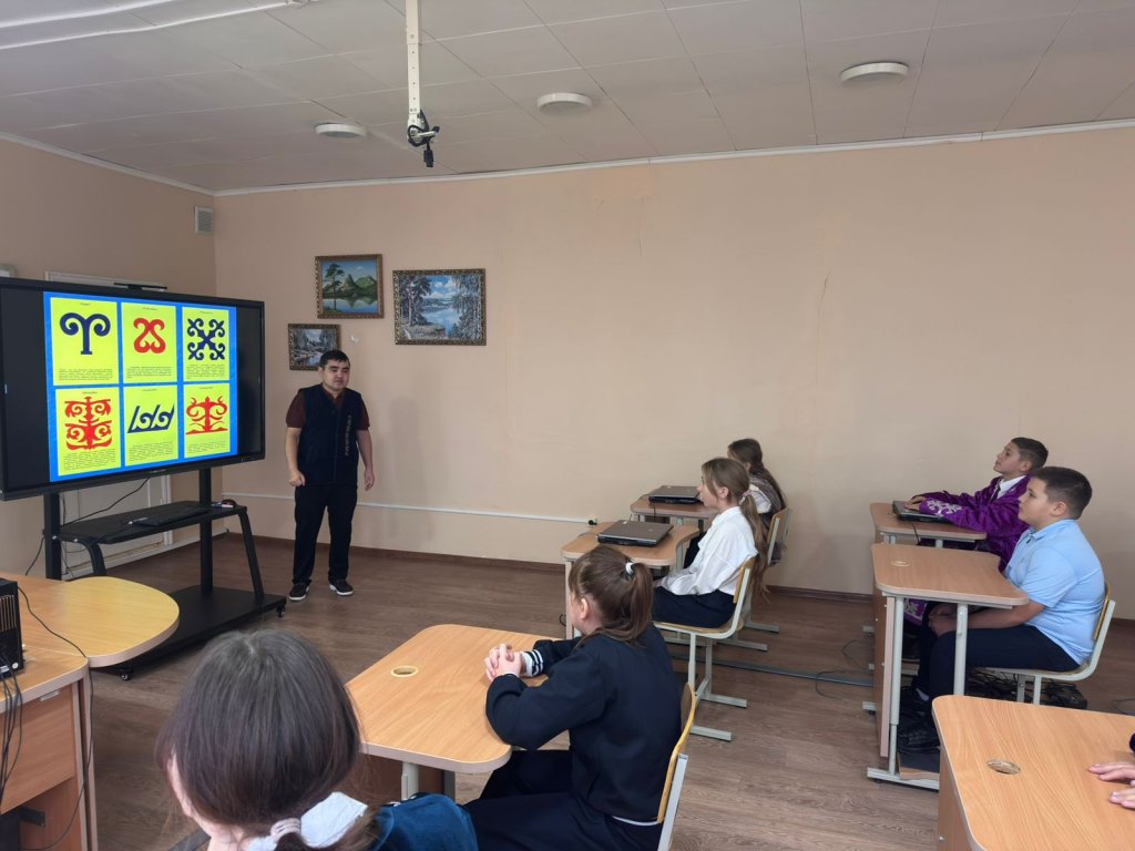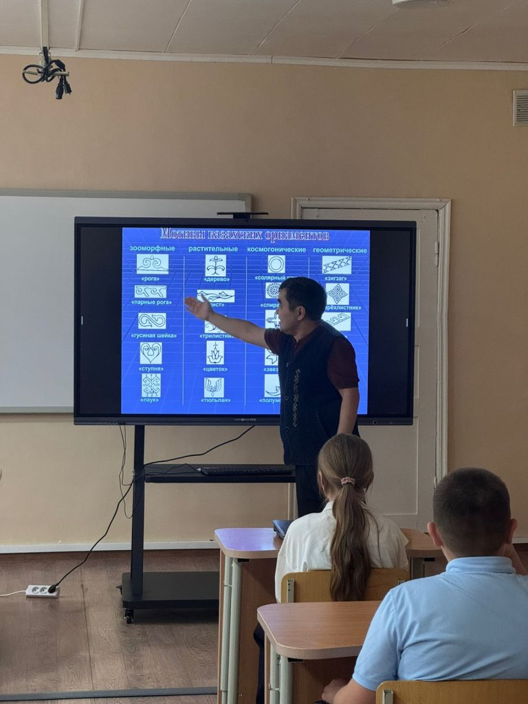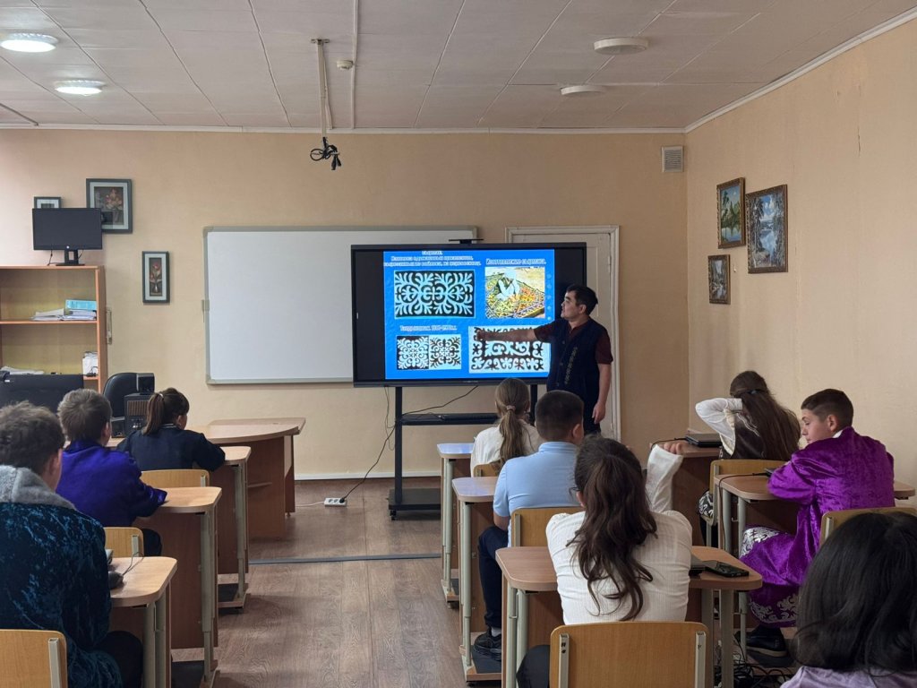 "Адал азамат" тәрбие бағдарламасына сәйкес әр сәрсенбіде Ұлттық киім күні 5-9 сынып оқушылары арасында қазақ ою-өрнегінің шығу тарихы тақырыбында сынып сағаты өтті"