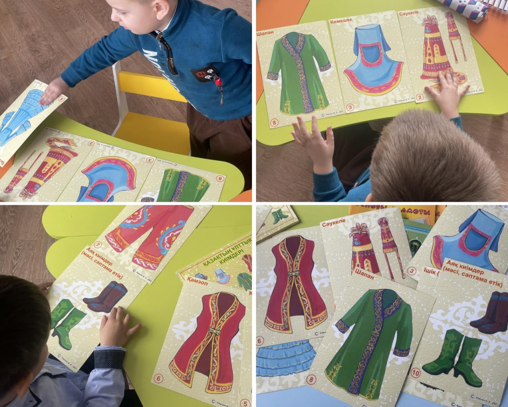 Сабақ барысында балалар қазақ халқының дәстүрлі киімінің қалай аталатынын біліп, оның элементтері мен ерекшеліктерін қарастырды